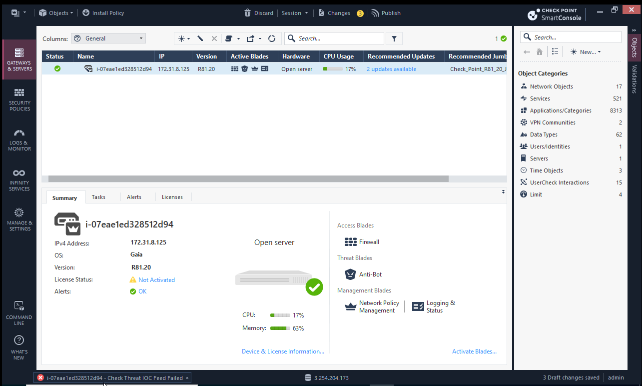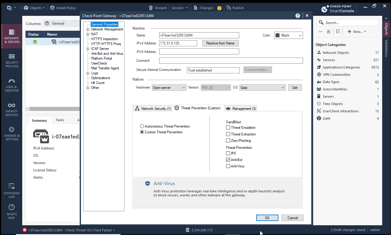 In the properties menu, select Threat Prevention (Custom), then activate at least Anti-Bot or Anti-Virus.